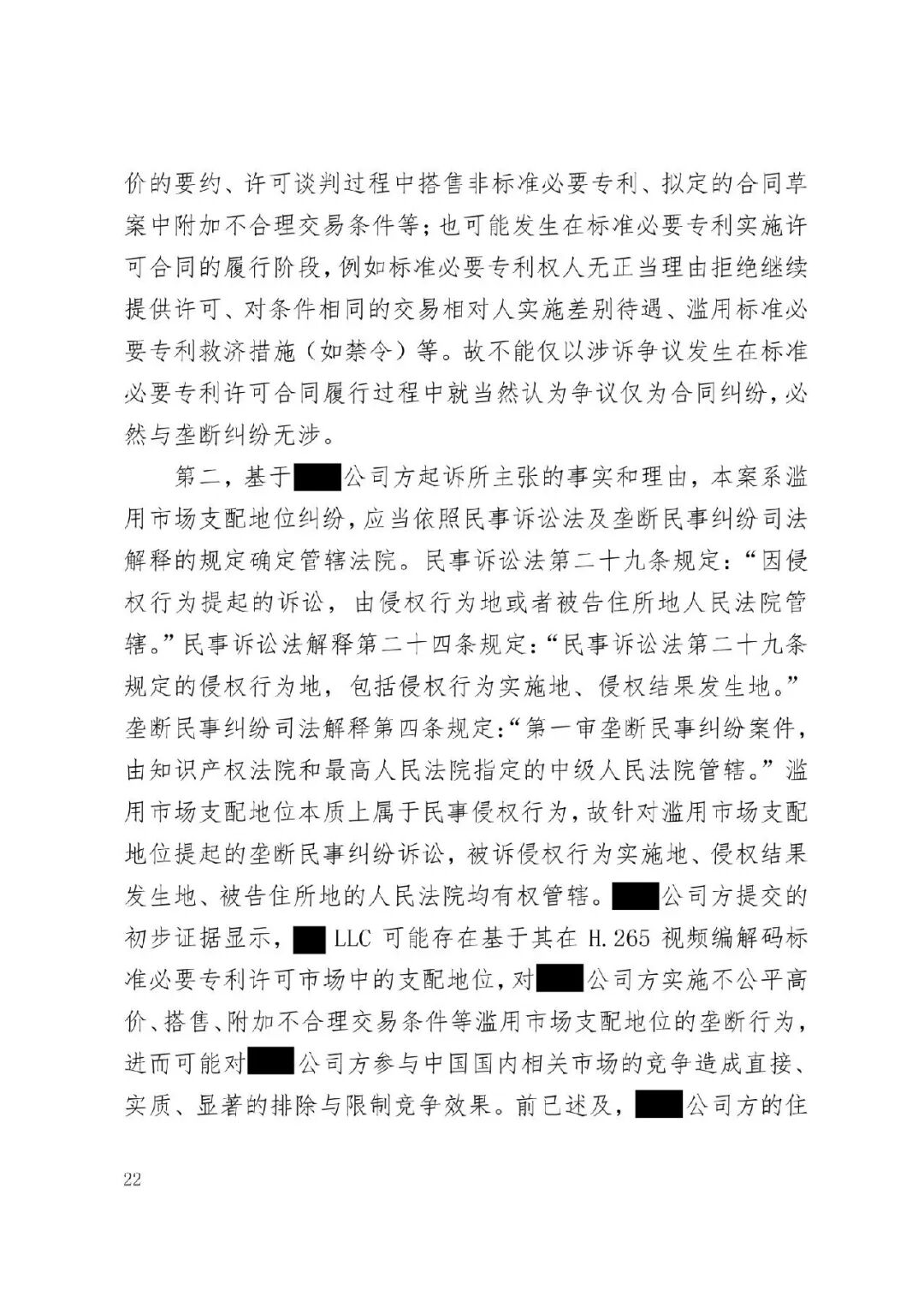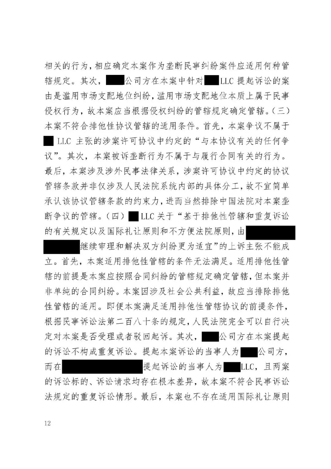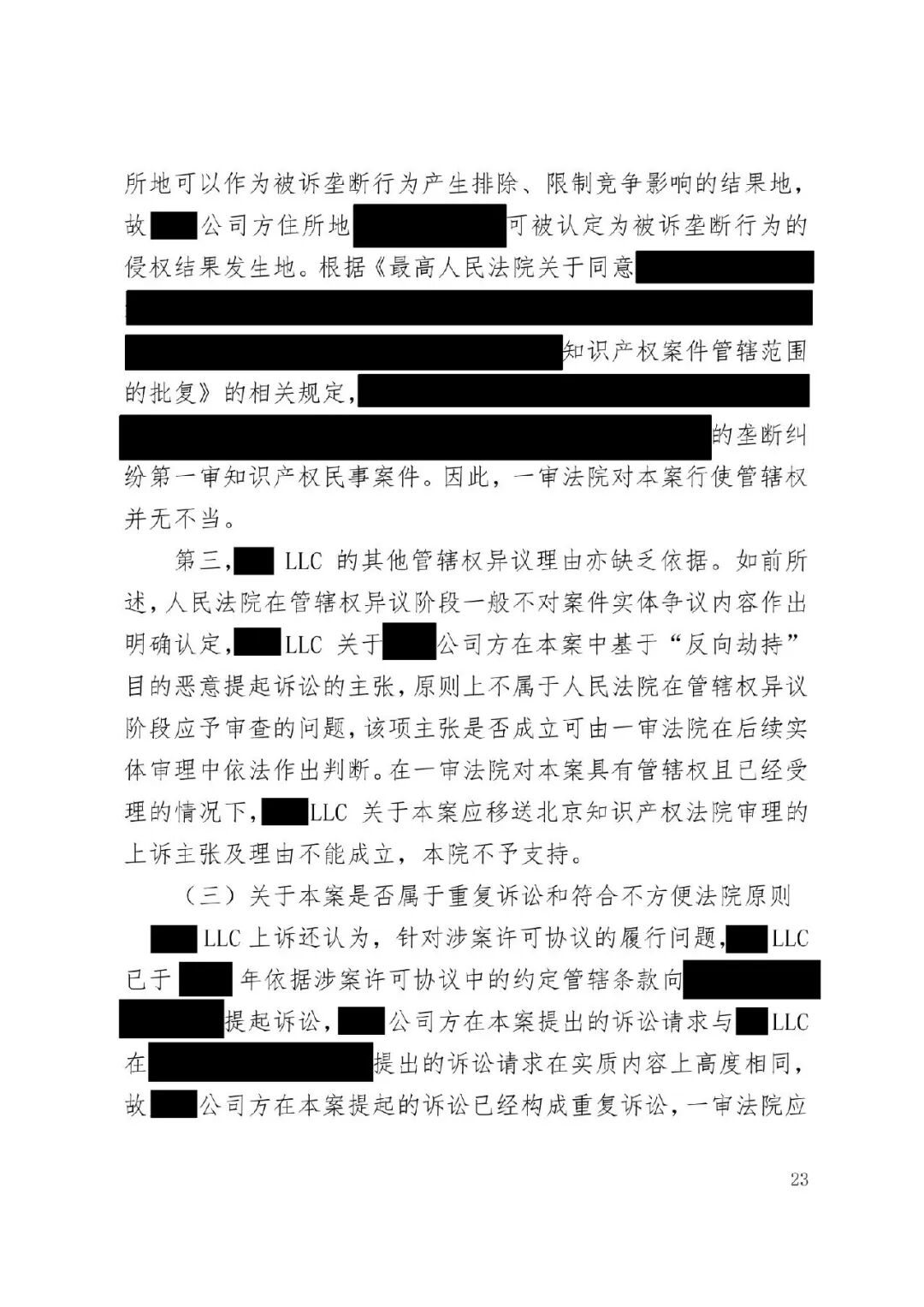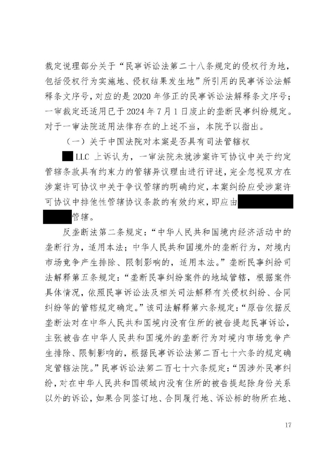 涉外案例 | 最高院明确涉外SEP垄断纠纷管辖规则:被诉垄断行为产生排除、限制竞争影响的结果地可作为管辖连结点发表时间:2026-01-12 13:35 案情回顾 被上诉方系中国国内知名企业,主要从事相关技术产品业务。美国LLC是一家依据美国法律成立的专利许可管理公司,负责管理H.265视频编解码标准必要专利池的许可事务。 被上诉方主张,美国LLC在H.265标准必要专利许可市场中具有支配地位,但在许可过程中,美国LLC实施了不公平高价、搭售非标准必要专利、附加不合理交易条件等滥用市场支配地位的行为,严重排除、限制了被上诉方在中国相关市场的竞争,并造成其经济损失。据此,被上诉方向一审法院提起垄断民事侵权诉讼,要求美国LLC停止侵权、赔偿损失。 美国LLC在提交答辩状期间对管辖权提出异议,核心理由是:本案实质是因履行双方《专利组合许可协议》产生的合同纠纷,而非垄断纠纷;该许可协议中已约定了争议解决管辖法院(某外国法院),且美国LLC已在该外国法院针对中国公司方提起了合同违约诉讼,两家中国公司未对管辖提出异议,应视为接受该外国法院管辖。因此,中国法院不应受理本案,或应驳回起诉,或将本案移送至北京知识产权法院审理。 一审法院经审理,裁定驳回美国LLC的管辖权异议。美国LLC不服,上诉至最高人民法院。 争议焦点 本案二审的核心争议焦点围绕管辖权展开,具体涉及: 1、中国法院对本案是否具有司法管辖权; 2、一审法院对本案行使管辖权是否适当; 3、本案是否构成重复诉讼或符合不方便法院原则而应驳回起诉? 裁判观点 一、中国法院对本案是否具有司法管辖权 **,涉案协议管辖条款不能排除中国法院管辖。其一,被上诉方之一并非该协议签约方,不受其约束。其二,该条款限制被上诉方另一公司起诉某国法院,却允许被告选择多国法院,属于“非对称管辖协议”,而非排他性管辖协议。其三,本案涉及滥用市场支配地位,关乎中国市场竞争秩序与社会公共利益,根据《民事诉讼法》第二百八十条,此类纠纷不能通过协议排除中国法院管辖。 第二,根据《反垄断法》第二条及垄断民事纠纷司法解释第六条,被诉垄断行为产生排除、限制竞争影响的结果地可作为管辖连结点。即使被诉行为发生在域外,但其排除、限制竞争的结果发生在我国境内。原告住所地可认定为侵权结果发生地,故中国法院依法享有管辖权。 第三,无论本案定性为侵权或合同纠纷,中国法院均有管辖权。侵权方面,原告住所地即侵权结果发生地位于中国。合同方面,涉案专利清单包含大量涉及中国授予的标准必要专利,部分诉讼标的物所在地位于中国境内;且作为被许可方的原告住所地及合同履行地均在中国。依据《民事诉讼法》第二百七十六条,上述连结点均支持中国法院行使管辖权。 故,中国法院对本案具有司法管辖权。 二、一审法院对本案行使管辖权是否适当 争议发生于标准必要专利许可合同履行过程中,并不意味其仅为合同纠纷而必然排除垄断纠纷的可能。基于一审原告方起诉所主张的事实和理由,本案案由为滥用市场支配地位纠纷,属于侵权纠纷,应依侵权行为地或被告住所地确定管辖。一审原告的住所地系被诉垄断行为产生排除、限制竞争影响的结果地,可作为侵权结果发生地,故一审法院依法对辖区内垄断纠纷具有一审管辖权。 此外,被告提出的其他管辖权异议理由不能成立。管辖权异议阶段仅需审查管辖连结点是否成立,无需审理如“反向劫持”等实体问题。在一审法院已合法受理本案的情况下,被告要求将案件移送北京知识产权法院的主张缺乏依据,最高院不予支持。 故,一审法院对本案行使管辖权是适当的。 三、本案是否构成重复诉讼或符合不方便法院原则而应驳回起诉? 1、本案不构成重复诉讼。美国LLC在外国提起的是合同违约之诉,而中国公司方在中国提起的是反垄断侵权之诉。两案在法律关系、事实基础及诉讼请求上均存在本质不同,属于基于牵连事实在不同法域提起的平行诉讼,而非同一纠纷。即便属于“同一纠纷”,根据《民事诉讼法》第二百八十条,当事人向外国法院起诉并不构成排除管辖的当然理由,亦不影响中国法院依法行使管辖权。 2、本案不符合“不方便法院原则”。该原则的适用须同时满足《民事诉讼法》第二百八十二条规定的五项条件,且由主张方承担举证责任。本案被诉垄断行为的损害结果发生在中国,涉及中国市场竞争秩序与社会公共利益,且美国LLC未举证证明中国法院审理明显不便或外国法院审理更为便利。因此,其主张不能成立。 裁判结果 最高人民法院最终裁定:驳回美国LLC公司的上诉,维持一审法院驳回其管辖权异议的原裁定。本裁定为终审裁定。 判决原文如下: ![]() ![]() ![]() ![]() ![]() ![]() ![]() ![]() ![]() ![]() ![]() ![]() ![]() ![]() ![]() ![]() ![]() ![]() ![]() ![]() ![]() ![]() ![]() ![]() ![]() ![]() ![]() |