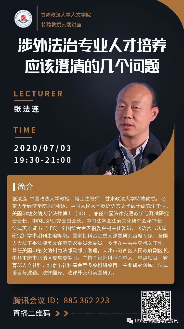 讲座速递 | 涉外法治专业人才培养应该澄清的几个问题发表时间:2020-07-02 14:39 习近平总书记指出,要加快推进我国法域外适用的法律体系建设,加强涉外法治专业人才培养,积极发展涉外法律服务。全国政协主席汪洋在十三届全国政协第34次双周协商座谈会上强调,中国日益走近世界舞台中央,这是一个需要也一定能够产生大批高素质涉外法律服务人才的时代。 新时代背景下,构建人类命运共同体需要一支涉外法治专业人才队伍维护国际秩序,“依法抗疫”更离不开涉外法治专业人才对国家主权、安全和人民群众利益的维护。 然而,我国当前涉外法治专业人才奇缺。人们对涉外法律人才和涉外法治专业人才培养的认识还存在许多误区。为此,张法连教授通过专题讲座来澄清涉外法治专业人才培养的一些核心问题。 讲座时间:7月3日19:30-21:00 ![]()